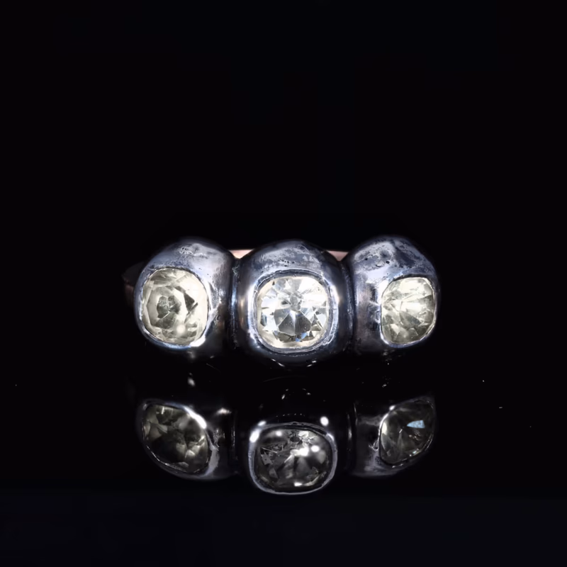 This outstanding ring features a faceted colourless paste and two faceted colourless quartz gemstones, both square cushion cut, rub over set in a chunky, rounded silver setting. The silver setting joins to a slim, plain, rosy band.