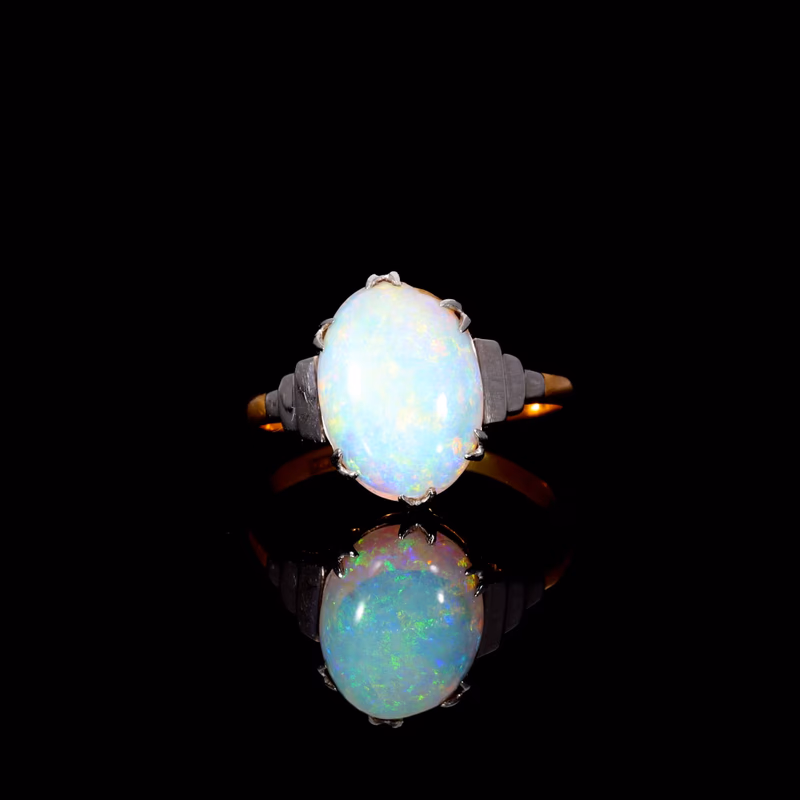 This outstanding vintage ring features a fabulous, lustrous opal with a rich play of colour, claw-set and framed by stepped shoulders in white metal, beautifully contrasting the high-carat yellow gold. The shoulders lead to a plain yellow gold band.