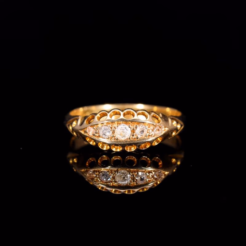 This antique ring features a unique boat-shaped setting that showcases five dazzling old-cut diamonds for 0.11ct. The openwork design allows as much light as possible to hit the diamonds and produce a wonderful sparkle.