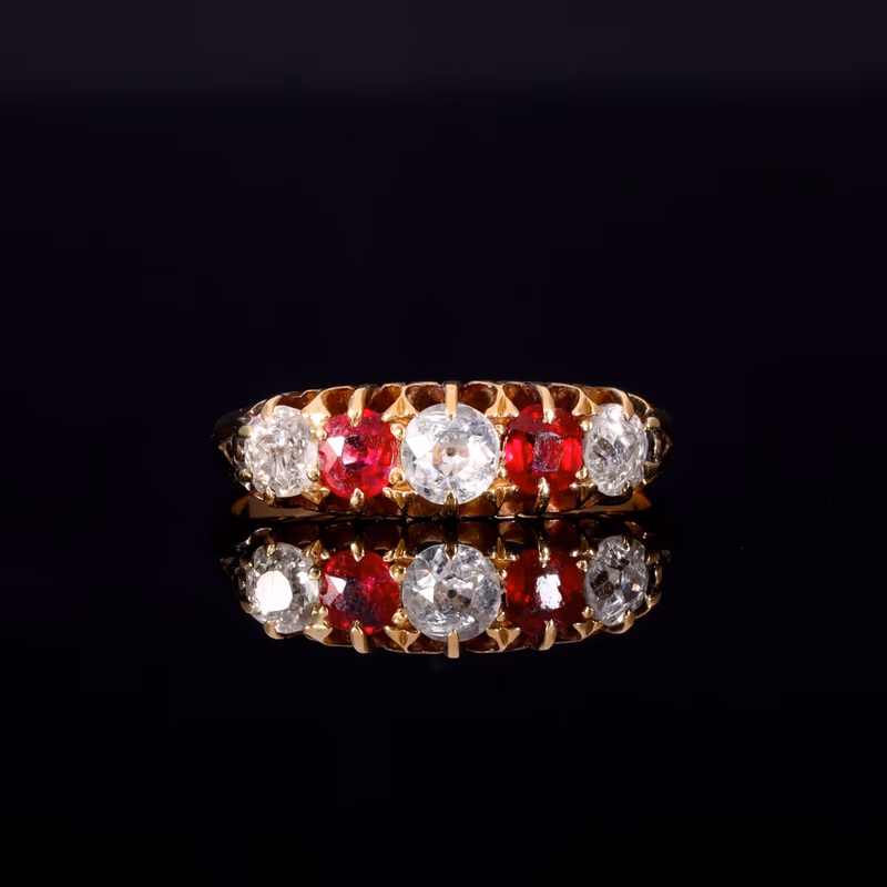 This dazzling ring features three sparkling old cut diamonds, sparkling away and dispersing the light beautifully. Alongside the central diamond sits two round mixed cut rubies, glowing in a deep orangish red. The stones are claw set which joins to lined shoulders and a plain band. The open claw setting allows light to flow throughout the ring, meaning the diamond's brilliance is highlighted, shining away to their true potential.