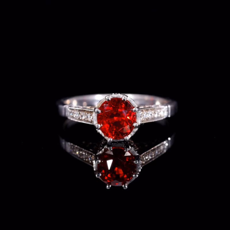 The centrepiece of this stunning ring is a rich and vibrant ruby, which is prong-set in a diamond-encrusted raised setting, set with 44 brilliant-cut round diamonds. The ruby weighs 1.65ct. The deep red hue of the ruby is a stunning contrast to the bright white diamonds surrounding it, creating a dazzling and eye-catching effect. This ring contains 0.18ct of diamonds.