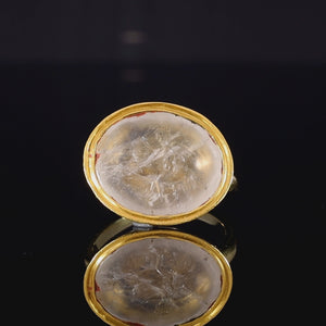 This incredible ring holds an ancient Roman intaglio dating back to the 2nd Century. Inset carved into the stone is a winged putto, likely Cupid, sat atop a phallus with fawn legs and hooved feet.