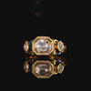 We use three methods together to determine age. When the assay office has used hallmarking letters to specify the year of manufacture we use those as our guide, when clear and unambiguous these give an exact year we present. If there are no hallmarks or the hallmarks are hard to discern on older antiques we factor in the style of the ring and the cut of the diamonds. The way diamonds have been cut over the centuries give a good guide to how best to date a ring, and jewellery, like clothing, has a fashion coherent with its era. Sometimes we also obtain jewellery in sets, where the dating of the other pieces from that set can act as a suggestion of age for the ring. Where an independent expert report is provided, that will state the details as assessed by an external expert. Presentations of year or era are a guide, but should not be considered a guarantee.
