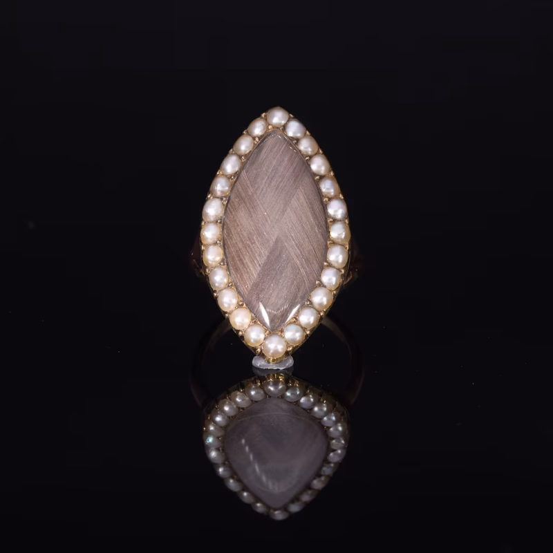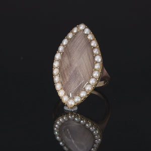 This stunning mourning ring features a navette-shaped head holding some immaculately preserved hair, woven into a criss-crossing pattern and lying under a slightly domed glass panel. The hairwork is surrounded by a border of yellowish-cream and greyish-cream seed pearls, giving this ring an ethereal look. In the Victorian era, pearls often represented tears in mourning pieces.