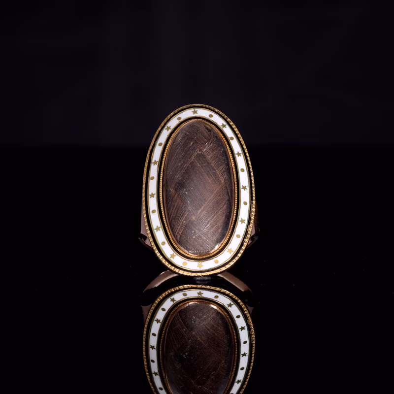 This ring features an elongated oval-shaped bezel set with intricately woven hairwork under a domed cover. Surrounding the hairwork is an elegant enamel frame delicately decorated with alternating gold stars and dots on a white enamel background, edged by a gold border. The refined craftsmanship and meaningful details offset the ring's simplicity.