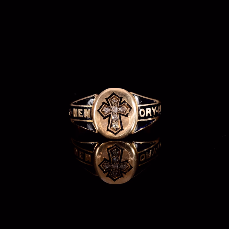 This mourning ring features an oval-shaped head with a cross design of six rose-cut diamonds outlined in black enamel. The cross is gothic, with exaggerated points that contrast beautifully with the sparkling diamonds. The head of the ring is framed by wide shoulders, heavily enamelled and reading 'IN.MEMORY.OF' in inlaid text. The enamel has a slight royal blue tinge in areas, not visible to the naked eye but apparent under our macro photography.