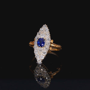 This stunning Victorian navette ring holds an impressive oval mixed cut deep blue sapphire, surrounded by 24 sparkling old cut diamonds. The navette is of impressive size, and the diamonds have breathtaking sparkle.