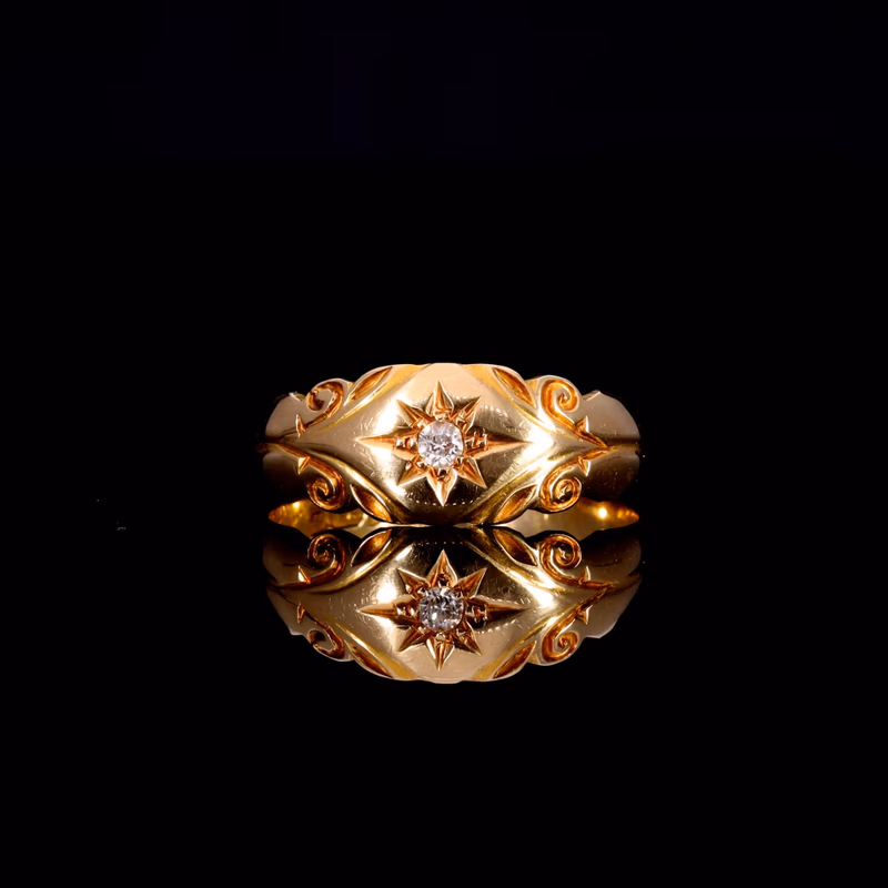 This gorgeous ring features a wide band centering on a star-shaped setting, filled with an incredible old European cut diamond for a total of 0.06ct. The kite-shaped head is adorned with scrollwork to each side and the ridged shoulders leads along the entirety of the band.