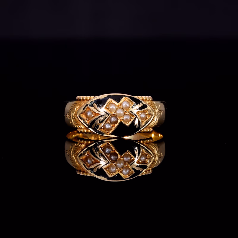 This fabulous mourning ring features a navette-shaped head with a cross motif cradling six lustrous split pearls. Black enamel surrounds the cross design, paired with fine gold detailing which houses two more seed pearls. There is ornate foliate metalwork to the shoulders and a beaded design to both the band's top and bottom. The band is of a plain design.