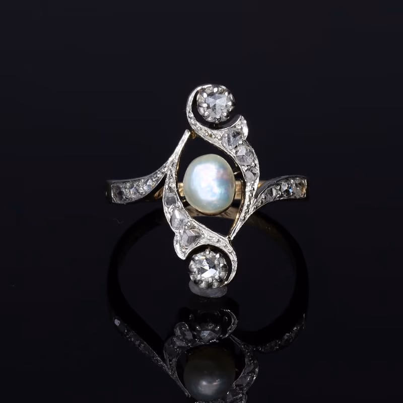 This dreamy antique ring features a silky baroque pearl which gleams with iridescence and displays a range of colours as it gleams in the light. Baroque pearls are irregularly shaped, often with an asymmetrical appearance that gives them a unique character and charm.