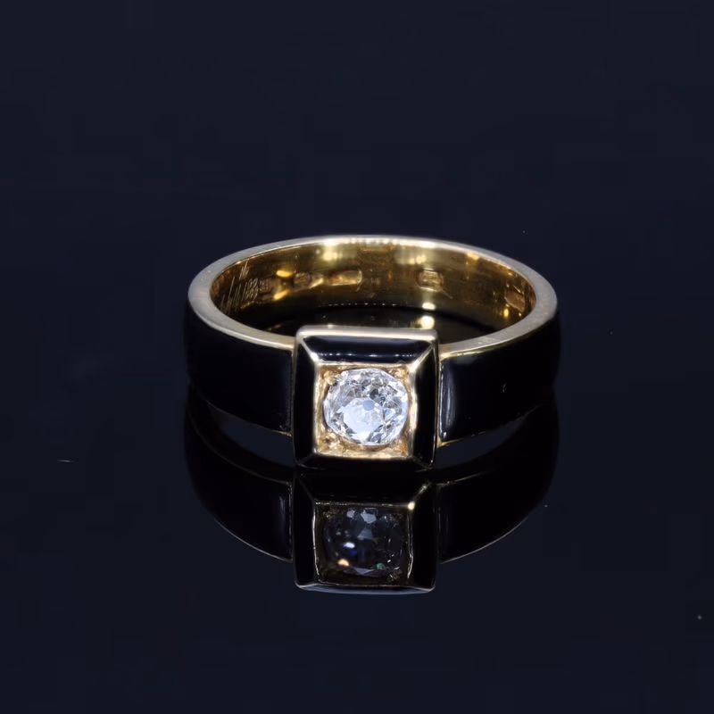 This outstanding mourning ring features a spectacular Old European Cut diamond in a square border applied with black enamel, which continues to the shoulders. The solitaire weighs 0.43ct.