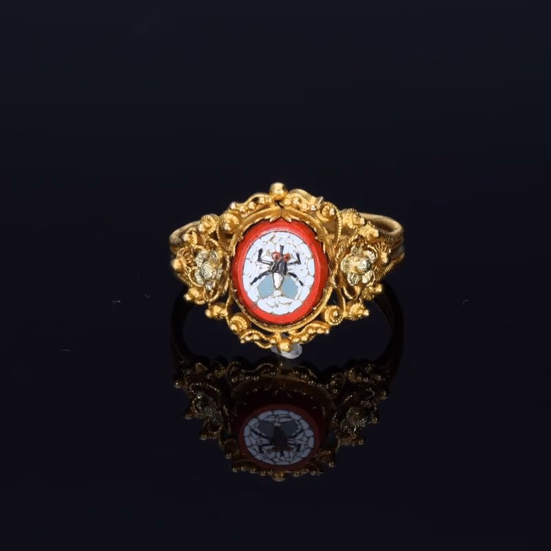 This outstanding micro mosaic ring depicts a fly, with grey wings and piercing red eyes, surrounded by a boarder of beautiful bright red. The cannetille mount has elegant beaded detailing surrounding the fly, and two floral motifs span across to the shoulders. The triple band has a textured appearance, which continues across the whole shank.