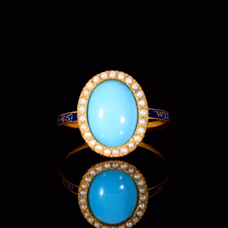 This Georgian mourning ring, dated 1781, is a timeless piece of sentimental craftsmanship. The oval design features a bright turquoise paste cabochon, likely a later addition to this piece, bordered by a delicate surround of natural seed pearls. The cluster head joins a thin navy blue enamel band with gold inlaid wording which reads ‘WILL M ALMACED . 3 . JAN . 1781 . AGED . 65’.