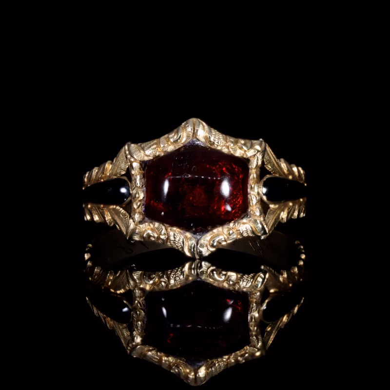 This early 19th-century mourning ring features a bold central foil-backed garnet in a deep crimson hue, framed by ornate goldwork. The shoulders of the ring are intricately carved with delicate leaf motifs, adding a naturalistic elegance to the design. Flanking the garnet are two black enamel teardrops, a traditional symbol of mourning. The combination of rich textures and materials makes this a striking example of memorial jewellery from the period.