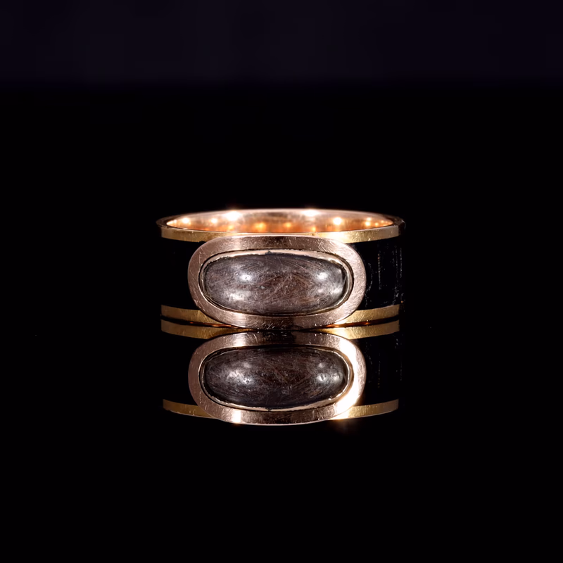This remarkable mourning ring features an oval-shaped colourless top with a piece of braided hairwork inlaid behind it. The shank has a band of black enamel running throughout.