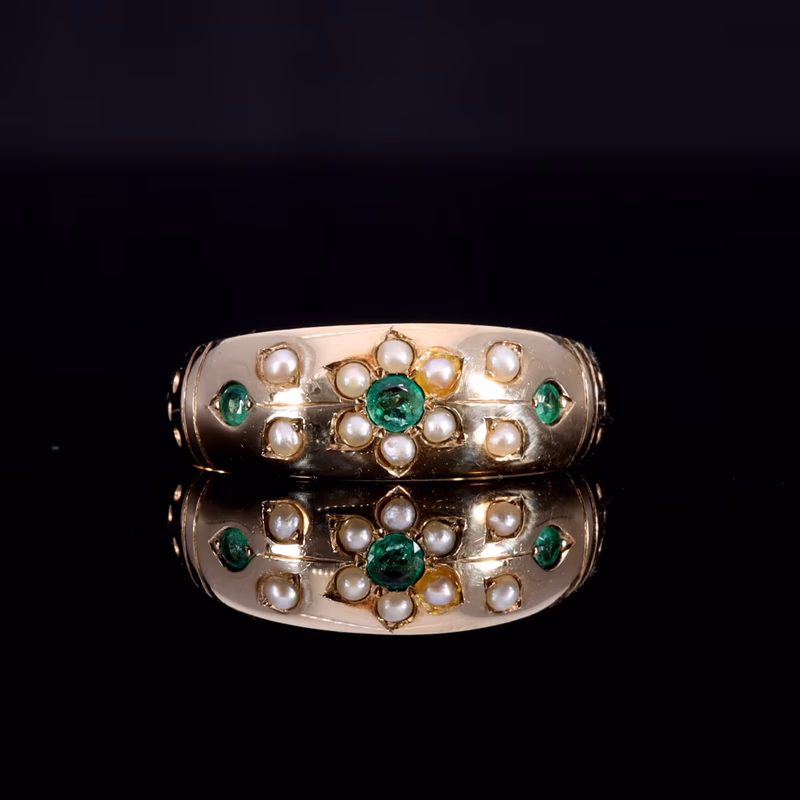 This gorgeous ring features three round mixed cut emerald gemstones, surrounded by ten dreamy pearls in deep settings on a wide band. The central emerald is the heart of a floral design, spanning out with further gemstones and lined detailing. More lined and dotted detailing embellishes the shoulders, which lead into a plain yellow gold band.