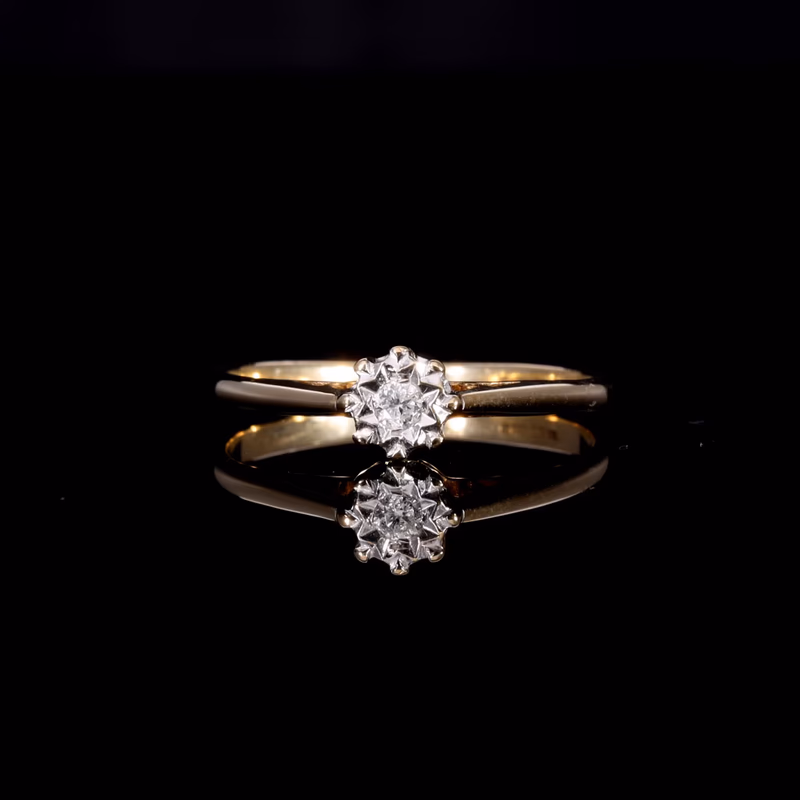 This stunning ring features a brilliant cut diamond at the centre, weighing approximately 0.05ct. The diamond is set in a star shaped illusion setting which joins to a yellow gold band.