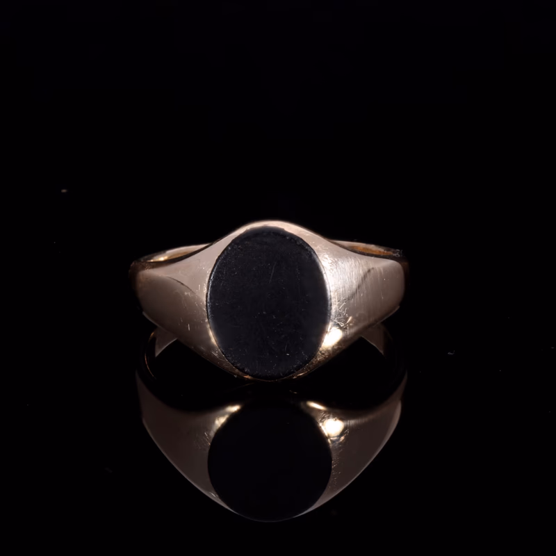 This classic signet ring features an oval onyx gemstone framed by sloping shoulders, which leads into a plain yellow gold band.